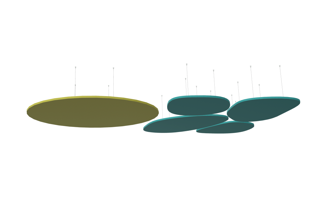 A wide variety of ceiling designs can be realised by individual forms and we offer a large choice of colours for the EchoSail®. While we offer standard shapes, bespoke shapes and sizes can be created to the customers requirements. EchoSail® can provide an impressive feature while also improving acoustic comfort within a room.